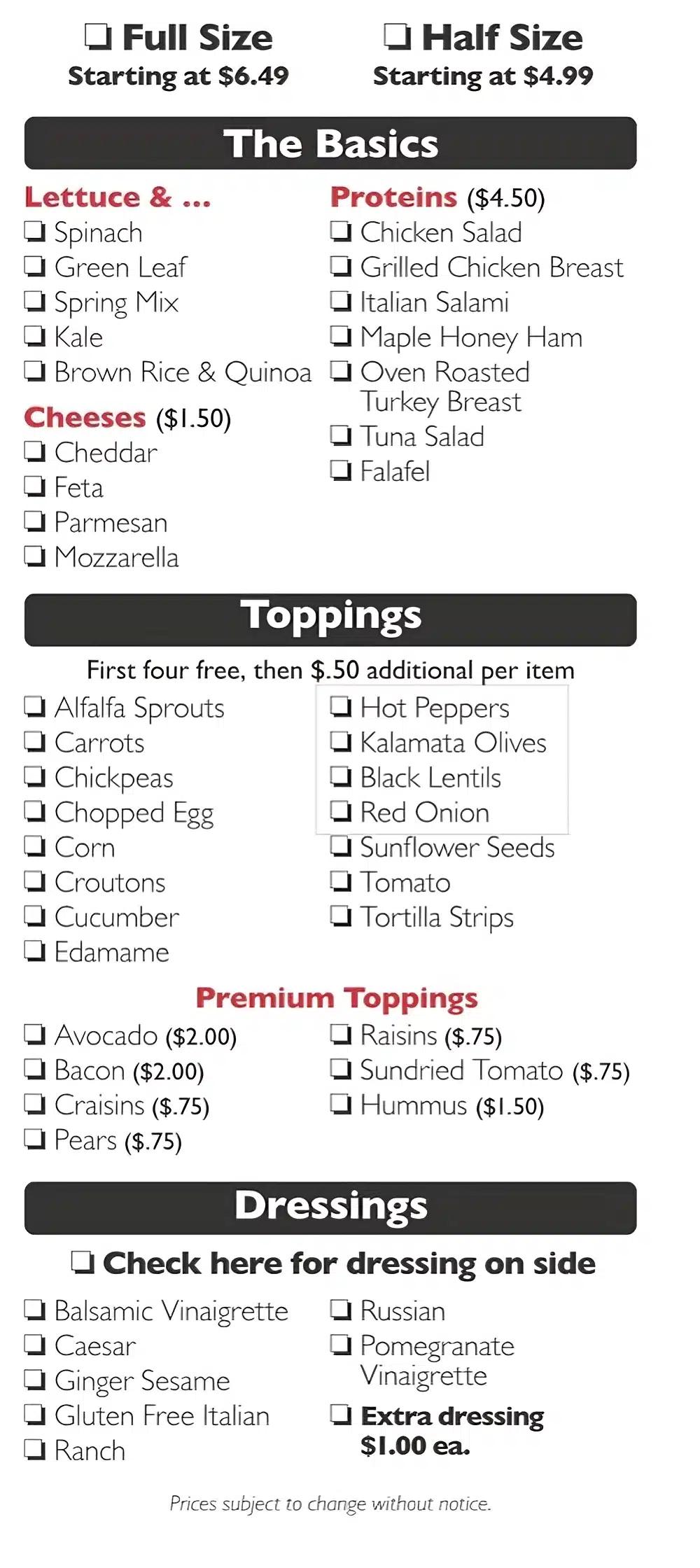 Chopped Salad Bar Choose from 30+ fresh ingredients and have your salad tossed right before your eyes! | $4.99 | $6.49 |
